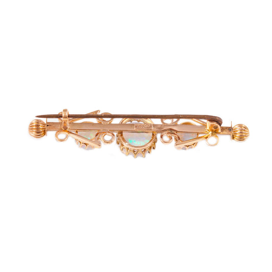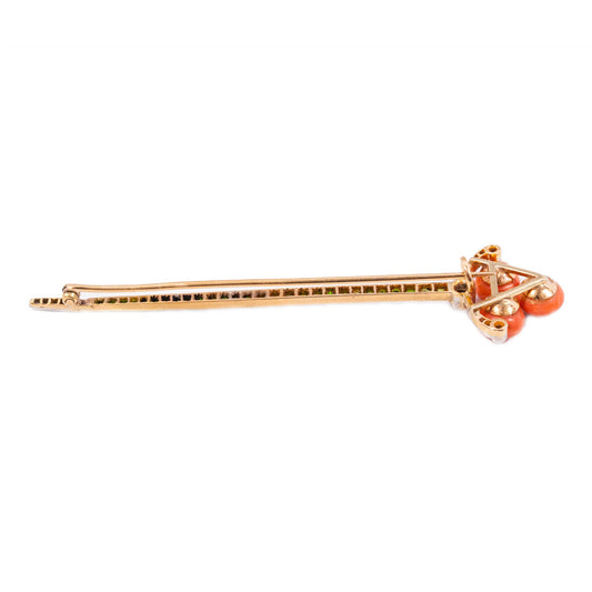 Russian Antique coral, demantoid garnet and diamond brooch in 18ct yellow gold