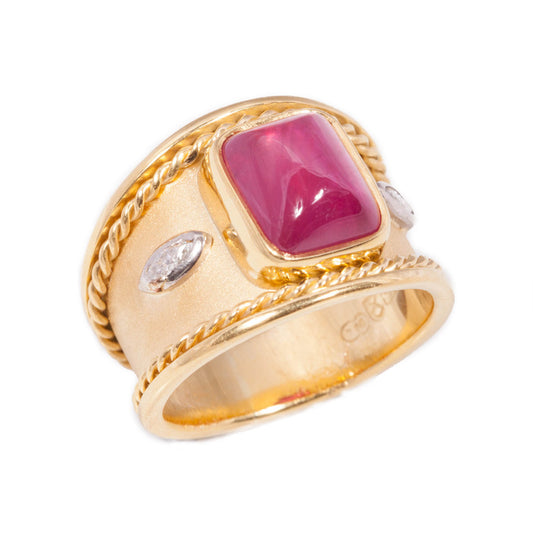 Handmade Cabochon Ruby and Diamond ring in 18ct yellow gold