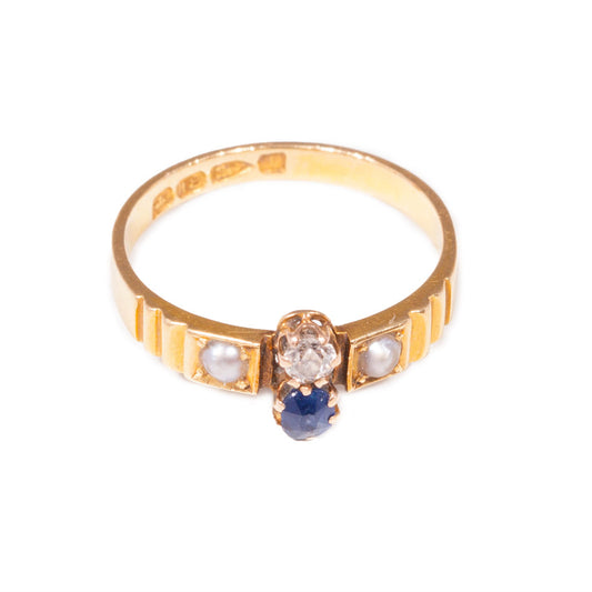 Antique Sapphire, Diamond & Seed Pearl Ring in 18ct