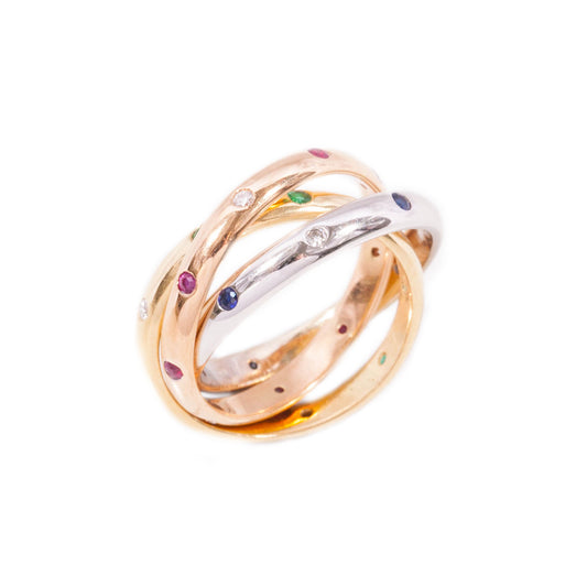 Russian wedding ring with Diamonds, Rubies, Emeralds and Sapphires in 18ct yellow, rose & white gold